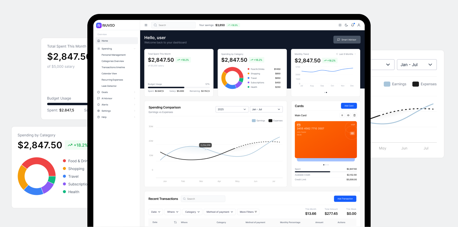 With a strong background in designing dashboards and data-driven interfaces, I saw in this project an opportunity to consolidate my experience into a complete financial management product. This motivation led me to design Nuvio, a personal finance dashboard focused on clarity, data visualization, and decision-making support.